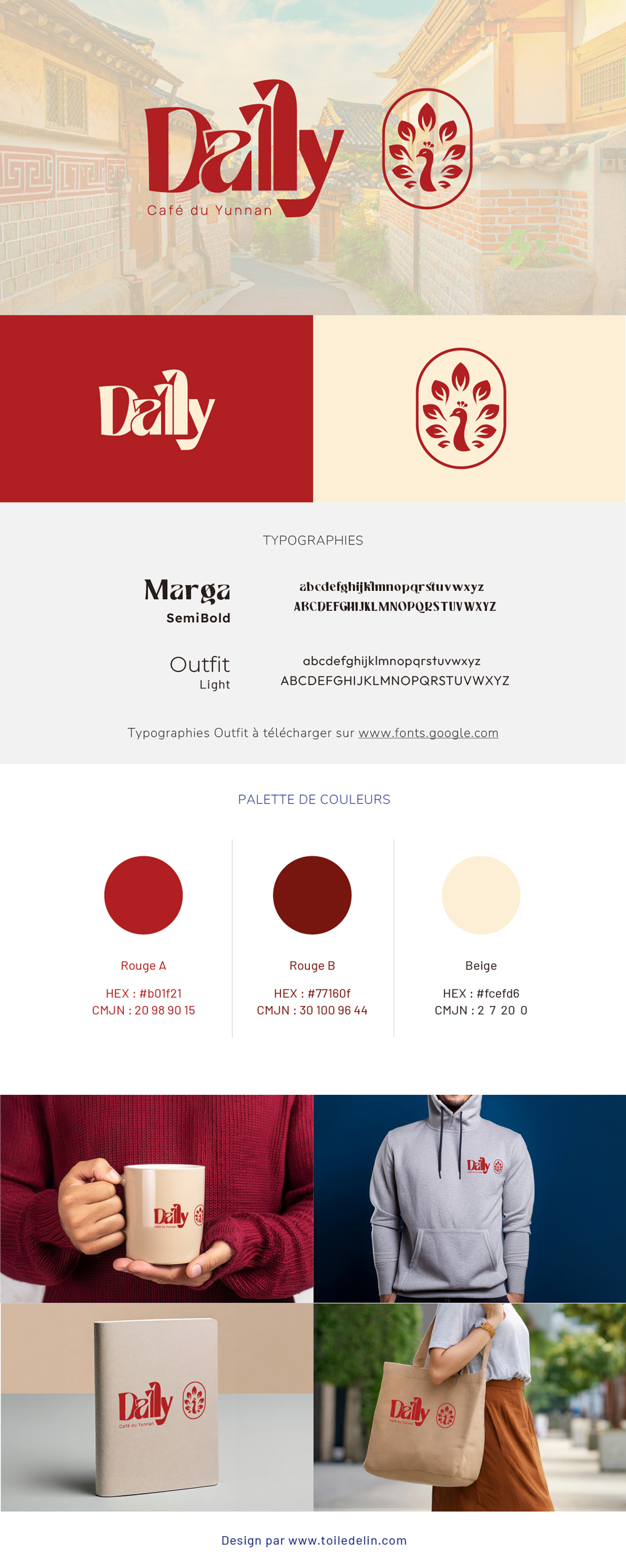 La palette repose sur un rouge profond et bordeaux, couleur chaude évocatrice des terres yunnanaises, associée à un beige crème pour apporter raffinement et lisibilité. Ensemble, ces teintes transmettent l’élégance, la chaleur et le dépaysement souhaités par le client.